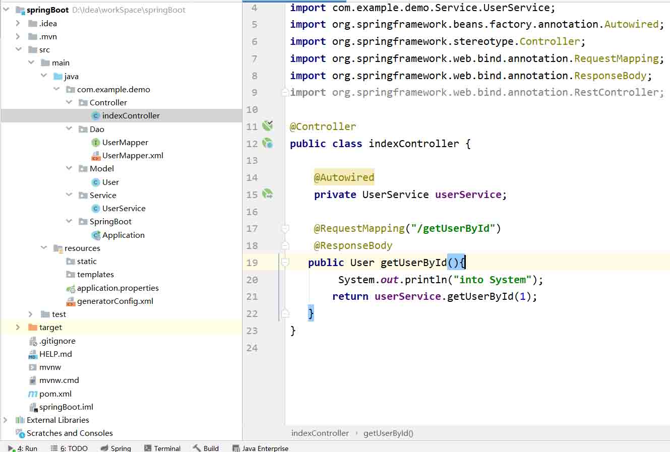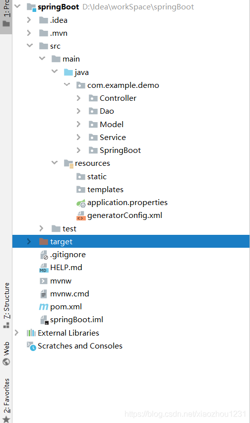 在springBoot 的目录中创建了Controler(控制层),Service(逻辑层),Model(实体类),Dao(数据层)