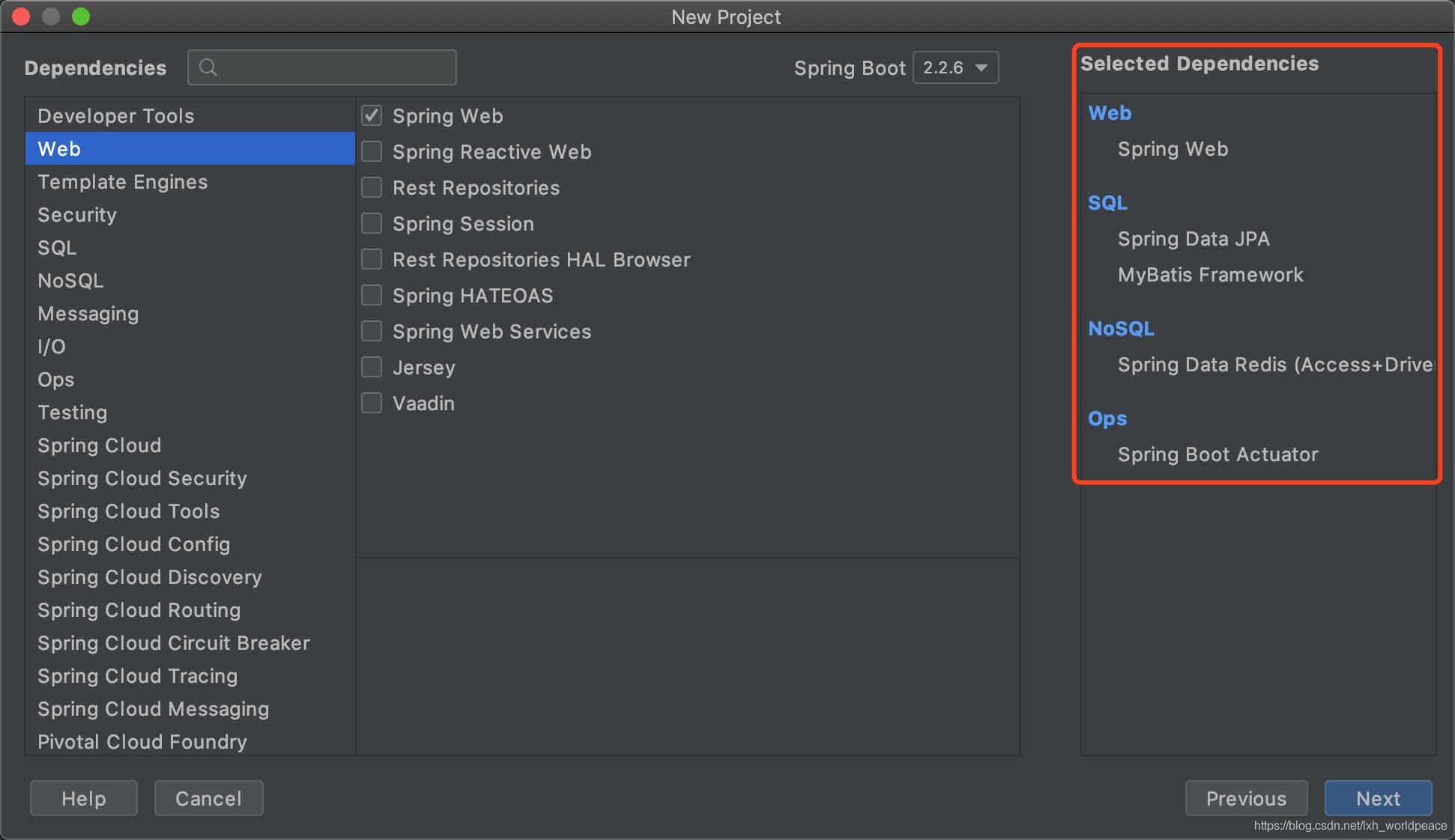 完成基本信息配置,在Web,SQL,NoSQL,Ops选项中,选择对应的模块依赖,最终选择如图以下几项: