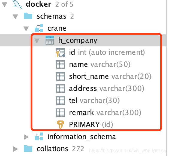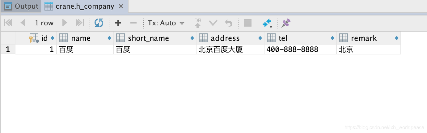 简单介绍两种从MySQL查询数据的案例,JPA方式和MyBatis方式。先启动好MySQL的docker容器,然后创建表h_company并插入一条数据,最终数据表结果如下图:
