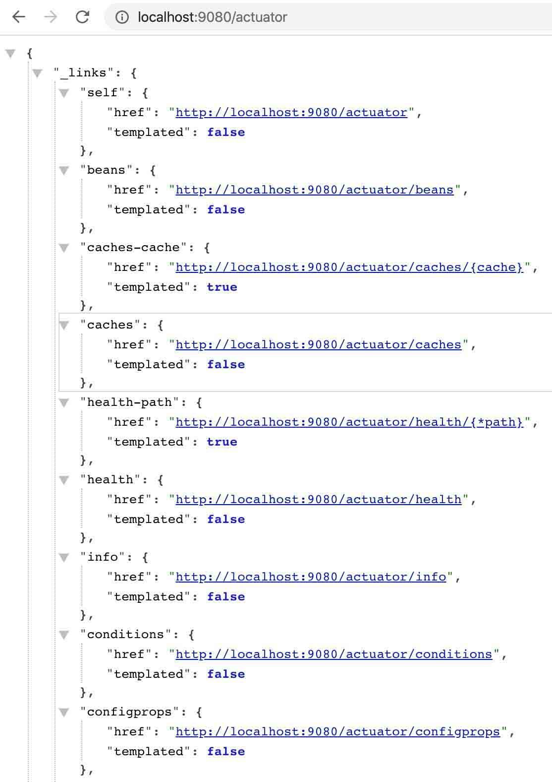 案例启用了完整的项目监测,可通过http://localhost:9080/actuator查看,每个监测项都对应相应的查看链接,如下图。