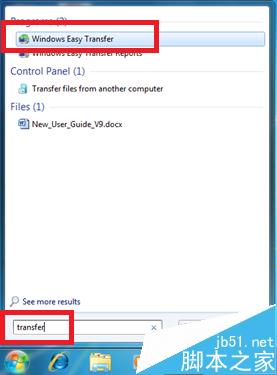 1、点击左下角的windows图标,在输入框中,输入 “transfer”,在搜索结果列表里你将在最上面看到 “Windows Easy transfer”,点击来启动它.