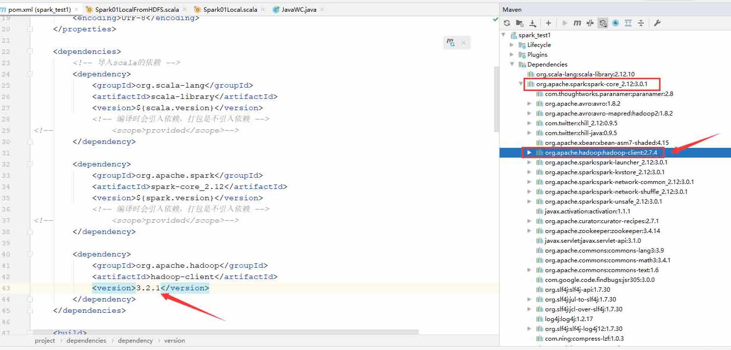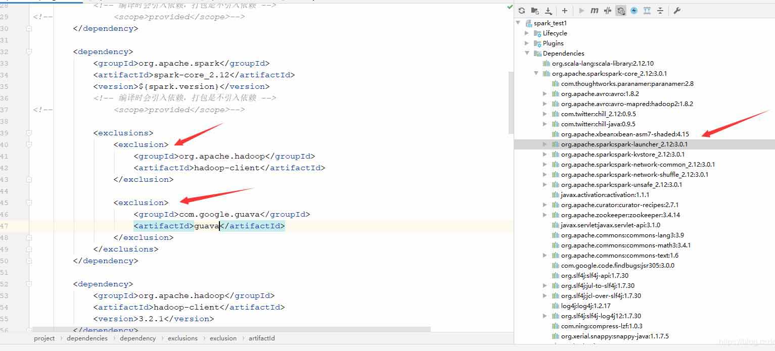 假如hadoop集群中hadoop版本是3.2.1,这时候为了保证程序能够顺利操作hadoop,需要引入hadoop-client的3.2.1版本。但这里也可以看到,spark-core_2.12内部也有对hadoop-client的依赖,而且版本是低版本的2.7.4,这时候往往就会产生冲突或者未知错误。所以需要使用exclusions做依赖排除。
