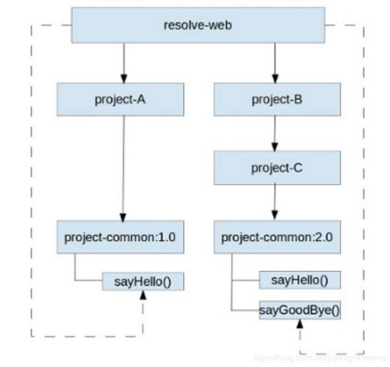 我们有一个web应用resolve-web,该工程依赖于project-A和project-B,project-A依赖于project-common的1.0版本并调用其中的sayHello()方法。project-B依赖于project-C,而project-C又进一步依赖于project-common的2.0版本并调用其中的sayGoodBye()方法。project-common的1.0和2.0版本是不同的,1.0中之包含sayHello()方法,而2.0中包含了sayHello()和sayGoodBye()两个方法。整个项目的依赖关系如下图: