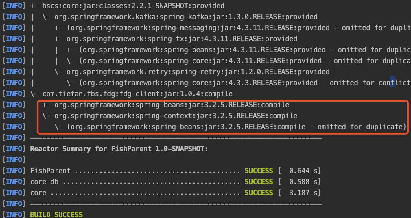 xujiaqingdeMacBook-Pro:mos jaycee$ mvn dependency:tree -Dverbose -Dincludes=org.springframework: [WARNING] [WARNING] Some problems were encountered while building the effective settings [WARNING] Unrecognised tag: 'mirror' (position: START_TAG seen ...e the preferredn | server for that repository.n |-->n <mirror>... @153:10) @ /software/apache-maven-3.6.0/conf/settings.xml, line 153, column 10 [WARNING] [INFO] Scanning for projects... [WARNING] [WARNING] Some problems were encountered while building the effective model for fish:core-db:jar:1.0-SNAPSHOT [WARNING] 'build.plugins.plugin.version' for org.apache.maven.plugins:maven-compiler-plugin is missing. @ fish:core-db:[unknown-version], /projects/mos/core-db/pom.xml, line 79, column 21 [WARNING] [WARNING] It is highly recommended to fix these problems because they threaten the stability of your build. [WARNING] [WARNING] For this reason, future Maven versions might no longer support building such malformed projects. [WARNING] [INFO] ------------------------------------------------------------------------ [INFO] Reactor Build Order: [INFO] [INFO] FishParent [pom] [INFO] core-db [jar] [INFO] core [war] [INFO] [INFO] --------------------------< fish:FishParent >--------------------------- [INFO] Building FishParent 1.0-SNAPSHOT [1/3] [INFO] --------------------------------[ pom ]--------------------------------- [INFO] [INFO] --- maven-dependency-plugin:2.8:tree (default-cli) @ FishParent --- [INFO] [INFO] ----------------------------< fish:core-db >---------------------------- [INFO] Building core-db 1.0-SNAPSHOT [2/3] [INFO] --------------------------------[ jar ]--------------------------------- [INFO] [INFO] --- maven-dependency-plugin:2.8:tree (default-cli) @ core-db --- [INFO] fish:core-db:jar:1.0-SNAPSHOT [INFO] - com.hand:hap-db:jar:3.5.4-RELEASE:compile [INFO] - com.hand:hap-core-db:jar:3.5.4-RELEASE:compile [INFO] - org.springframework:spring-core:jar:4.3.11.RELEASE:compile [INFO] [INFO] -----------------------------< fish:core >------------------------------ [INFO] Building core 1.0-SNAPSHOT [3/3] [INFO] --------------------------------[ war ]--------------------------------- [INFO] [INFO] --- maven-dependency-plugin:2.8:tree (default-cli) @ core --- [INFO] fish:core:war:1.0-SNAPSHOT [INFO] +- com.hand:hap-db:jar:3.5.4-RELEASE:compile [INFO] | - com.hand:hap-core-db:jar:3.5.4-RELEASE:compile [INFO] | - org.springframework:spring-core:jar:4.3.11.RELEASE:compile [INFO] +- com.hand:hap-pom:pom:3.5.4-RELEASE:provided [INFO] | +- com.hand:hap-core:jar:classes:3.5.4-RELEASE:provided [INFO] | | +- (org.springframework:spring-core:jar:4.3.11.RELEASE:provided - omitted for duplicate) [INFO] | | +- org.springframework:spring-jdbc:jar:4.3.11.RELEASE:provided [INFO] | | | +- org.springframework:spring-beans:jar:4.3.11.RELEASE:provided [INFO] | | | | - (org.springframework:spring-core:jar:4.3.11.RELEASE:provided - omitted for duplicate) [INFO] | | | +- (org.springframework:spring-core:jar:4.3.11.RELEASE:provided - omitted for duplicate) [INFO] | | | - (org.springframework:spring-tx:jar:4.3.11.RELEASE:provided - omitted for duplicate) [INFO] | | +- org.springframework:spring-test:jar:4.3.11.RELEASE:provided [INFO] | | | - (org.springframework:spring-core:jar:4.3.11.RELEASE:provided - omitted for duplicate) [INFO] | | +- org.springframework:spring-context:jar:4.3.11.RELEASE:provided [INFO] | | | +- org.springframework:spring-aop:jar:4.3.11.RELEASE:provided [INFO] | | | | +- (org.springframework:spring-beans:jar:4.3.11.RELEASE:provided - omitted for duplicate) [INFO] | | | | - (org.springframework:spring-core:jar:4.3.11.RELEASE:provided - omitted for duplicate) [INFO] | | | +- (org.springframework:spring-beans:jar:4.3.11.RELEASE:provided - omitted for duplicate) [INFO] | | | +- (org.springframework:spring-core:jar:4.3.11.RELEASE:provided - omitted for duplicate) [INFO] | | | - org.springframework:spring-expression:jar:4.3.11.RELEASE:provided [INFO] | | | - (org.springframework:spring-core:jar:4.3.11.RELEASE:provided - omitted for duplicate) [INFO] | | +- org.springframework:spring-context-support:jar:4.3.11.RELEASE:provided [INFO] | | | +- (org.springframework:spring-beans:jar:4.3.11.RELEASE:provided - omitted for duplicate) [INFO] | | | +- (org.springframework:spring-context:jar:4.3.11.RELEASE:provided - omitted for duplicate) [INFO] | | | - (org.springframework:spring-core:jar:4.3.11.RELEASE:provided - omitted for duplicate) [INFO] | | +- org.springframework:spring-web:jar:4.3.11.RELEASE:provided [INFO] | | | +- (org.springframework:spring-aop:jar:4.3.11.RELEASE:provided - omitted for duplicate) [INFO] | | | +- (org.springframework:spring-beans:jar:4.3.11.RELEASE:provided - omitted for duplicate) [INFO] | | | +- (org.springframework:spring-context:jar:4.3.11.RELEASE:provided - omitted for duplicate) [INFO] | | | - (org.springframework:spring-core:jar:4.3.11.RELEASE:provided - omitted for duplicate) [INFO] | | +- org.springframework:spring-webmvc:jar:4.3.11.RELEASE:provided [INFO] | | | +- (org.springframework:spring-aop:jar:4.3.11.RELEASE:provided - omitted for duplicate) [INFO] | | | +- (org.springframework:spring-beans:jar:4.3.11.RELEASE:provided - omitted for duplicate) [INFO] | | | +- (org.springframework:spring-context:jar:4.3.11.RELEASE:provided - omitted for duplicate) [INFO] | | | +- (org.springframework:spring-core:jar:4.3.11.RELEASE:provided - omitted for duplicate) [INFO] | | | +- (org.springframework:spring-expression:jar:4.3.11.RELEASE:provided - omitted for duplicate) [INFO] | | | - (org.springframework:spring-web:jar:4.3.11.RELEASE:provided - omitted for duplicate) [INFO] | | +- org.springframework.data:spring-data-redis:jar:1.7.0.RELEASE:provided [INFO] | | | +- org.springframework.data:spring-data-keyvalue:jar:1.1.0.RELEASE:provided [INFO] | | | | +- org.springframework.data:spring-data-commons:jar:1.12.0.RELEASE:provided [INFO] | | | | | +- (org.springframework:spring-core:jar:4.2.5.RELEASE:provided - omitted for conflict wi