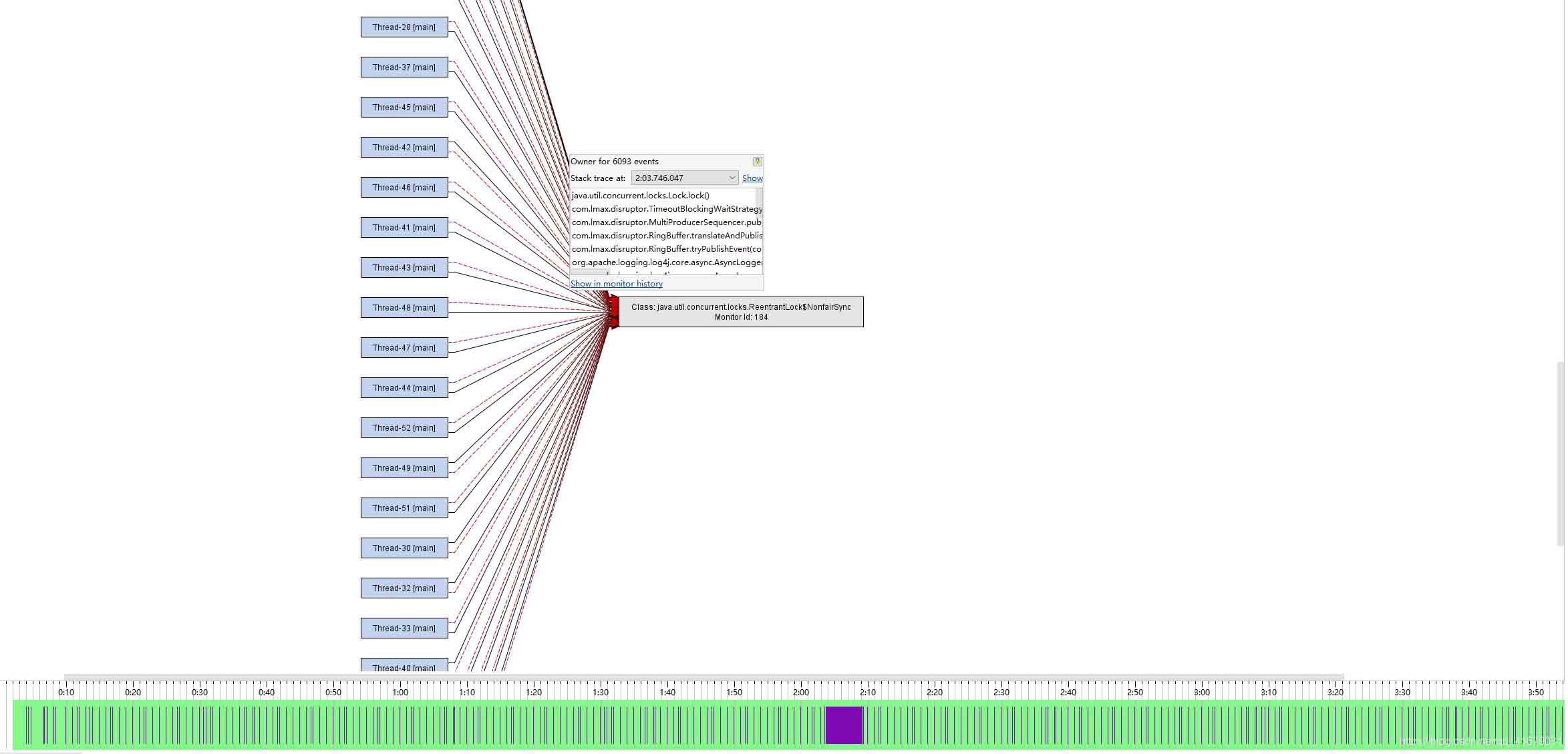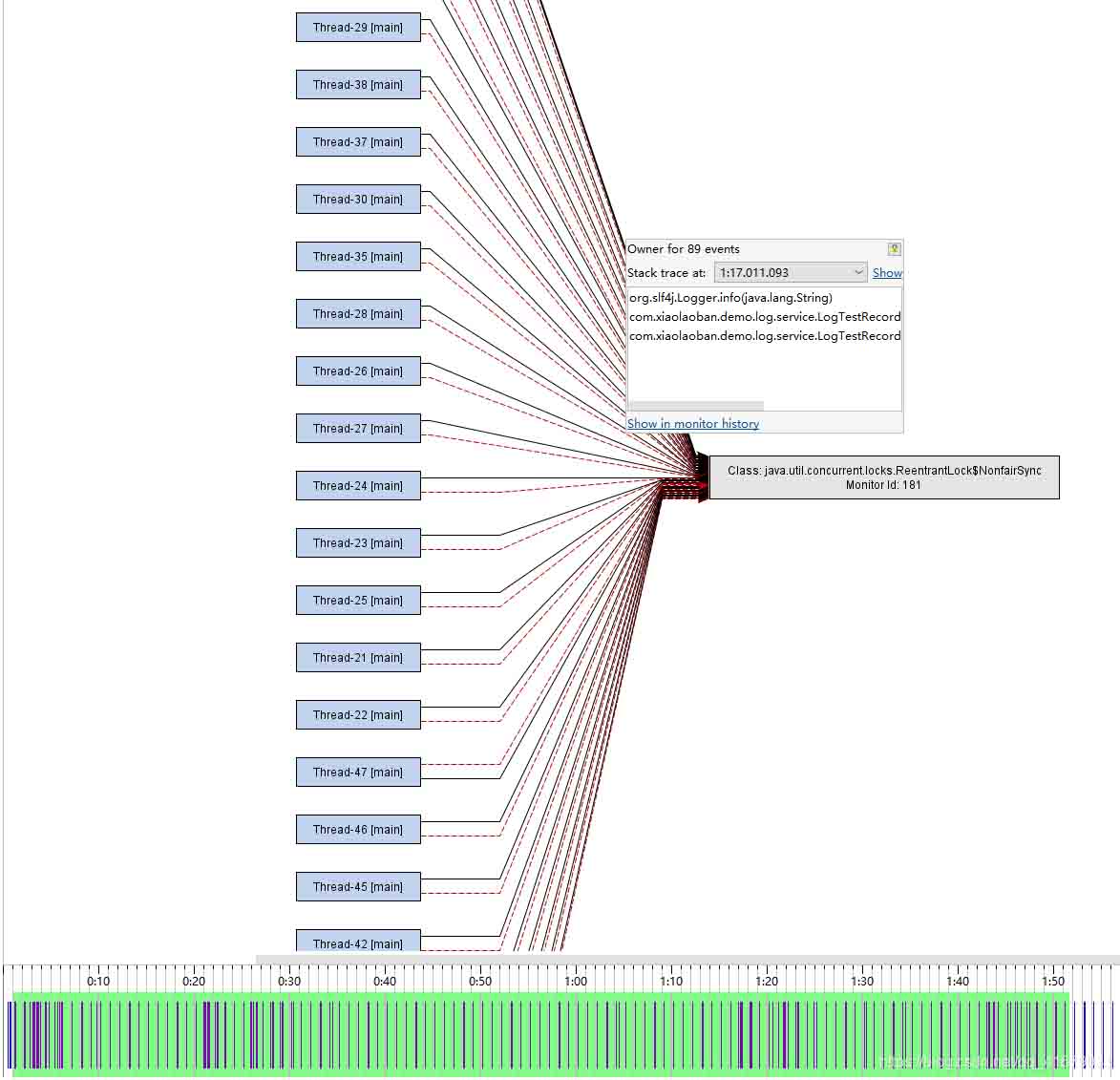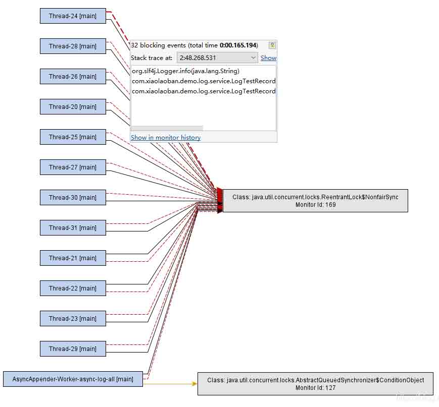 线程发生多次占用锁的情况。查看Logback源码可得知,检查容量、放入队列、取出队列都需要在取得锁后进行