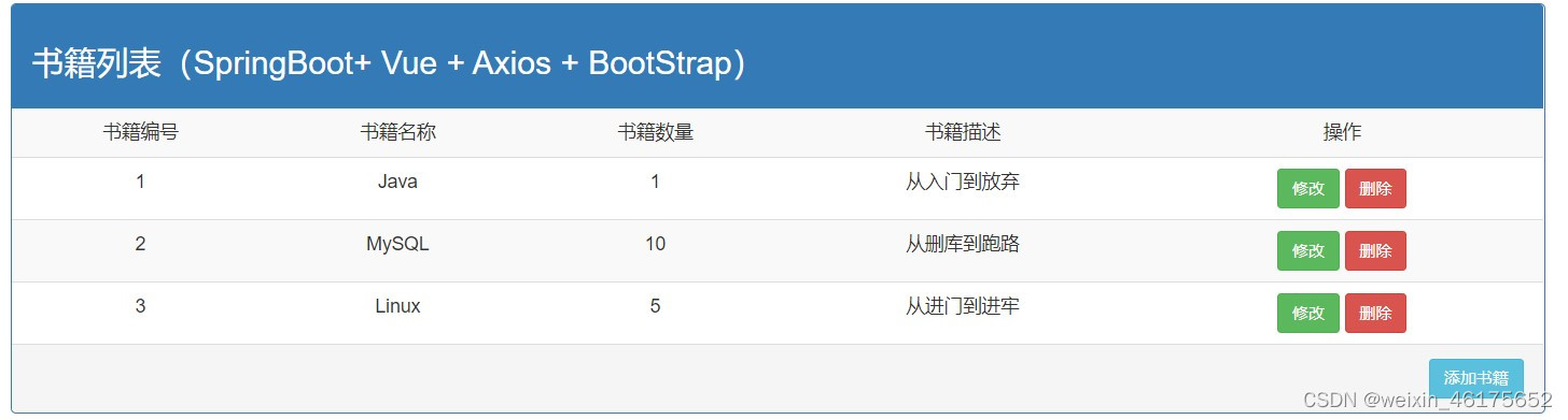 <h3>书籍列表(SpringBoot+ Vue + Axios + BootStrap)</h3>