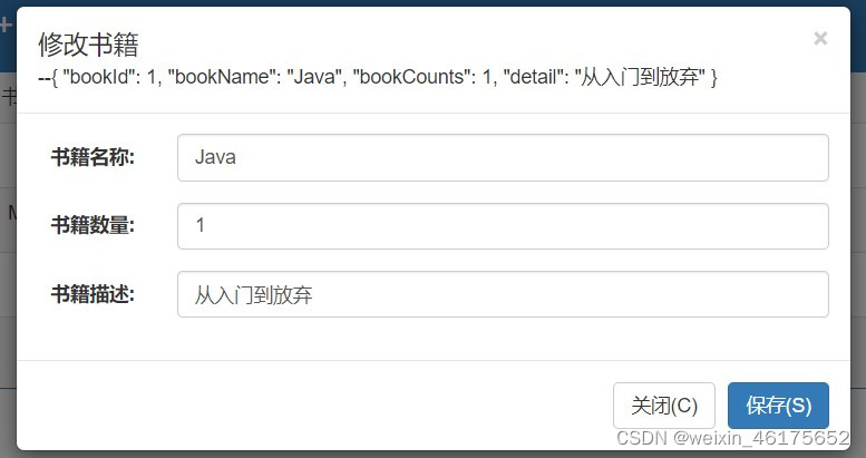 以上就是专一帅哥最近收集整理的关于SpringBoot+Vue+Axios+BootStrap实现图书的增删改查功能示例的全部内容,更多相关SpringBoot+Vue+Axios+BootStrap实现图书内容请搜索靠谱客的其他文章。