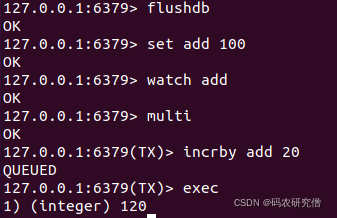 127.0.0.1:6379> flushdb OK 127.0.0.1:6379> set add 100 OK 127.0.0.1:6379> watch add OK 127.0.0.1:6379> multi OK 127.0.0.1:6379(TX)> incrby add 20 QUEUED 127.0.0.1:6379(TX)> exec 1) (integer) 120 127.0.0.1:6379>