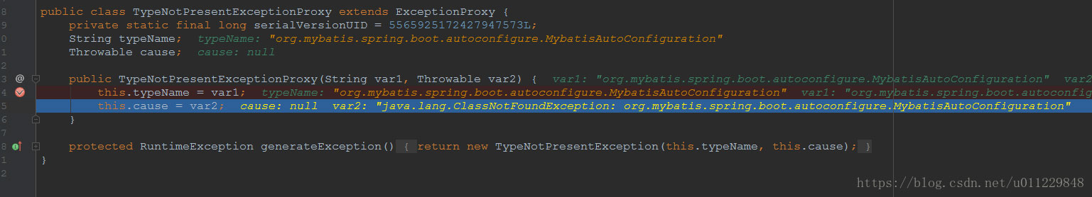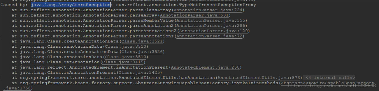 没办法,只能在异常类里面打断点看,异常是java.lang.ArrayStoreException: sun.reflect.annotation.TypeNotPresentExceptionProxy,那就在TypeNotPresentExceptionProxy构造中打断点