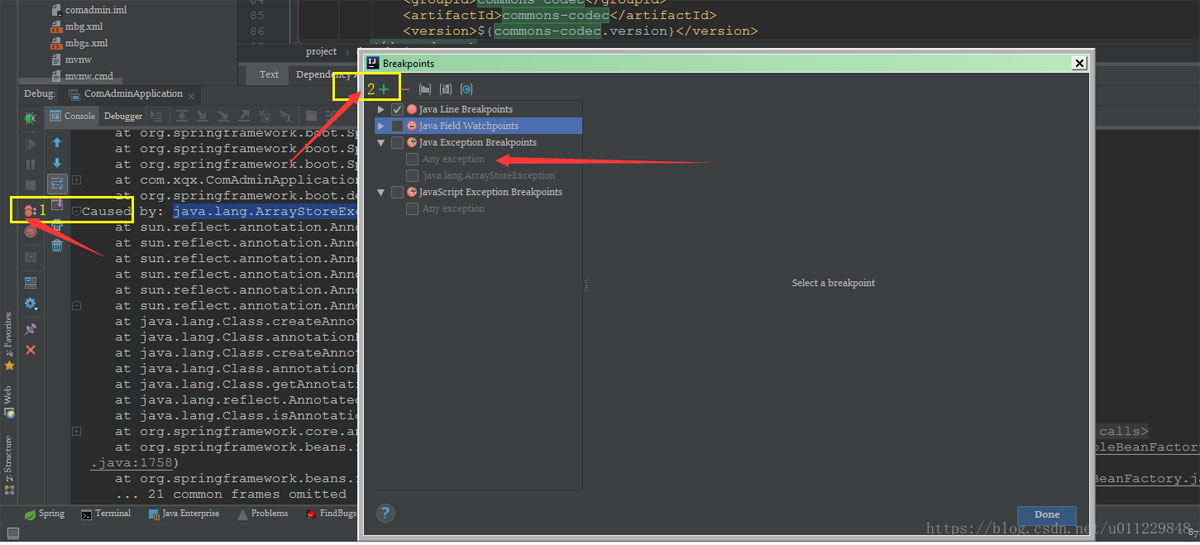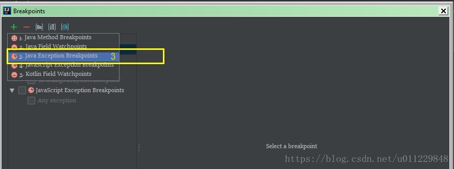 idea工具使用 Java Exception Breakpoint 添加异常断点,在IDE里,新建一个断点,类型是Java Exception Breakpoint