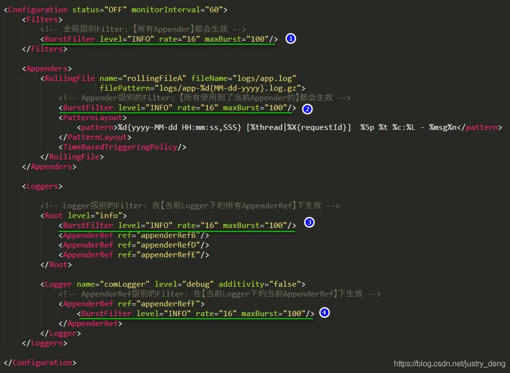 log4j2在处理日志时,各个Filter会组成过滤链,越靠前的Filter越先过滤,自然影响范围就越大。在log4j2的xml配置文件中,Filter可以配置在四个位置,由全局到局部依次是 Context-wide、 Logger和Appender、AppenderReference, 图示说明: