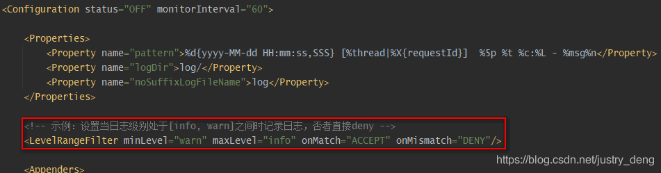 | LevelRangeFilter | 若${maxLevel} <= 日志级别 <= ${minLevel}, 则onMatch,否则onMismatch 如: 即为只记录日志info及warn级别的日志。 | 是 |
