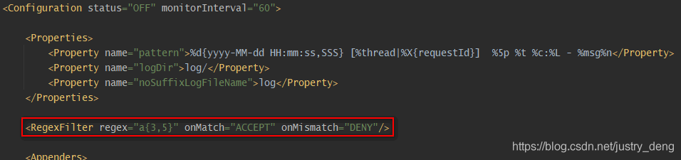 | RegexFilter | 如果日志信息匹配${指定的正则表达式},则onMatch,否则onMismatch 注:可通过useRawMsg属性来控制这个日志信息是格式化处理后(即:最终)的日志信息,还是格式化处理前(即:代码中输入)的日志信息。 | 是 |