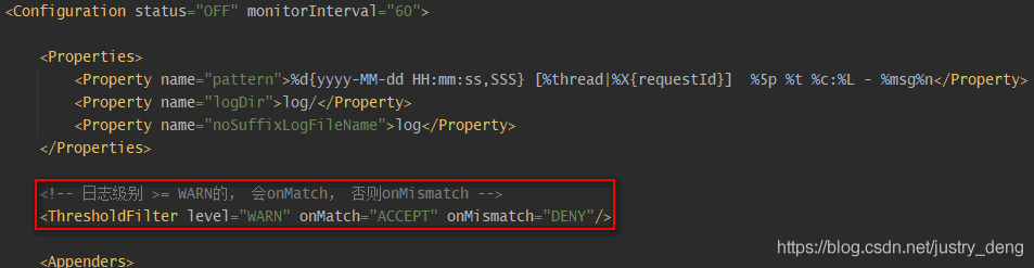 | ThresholdFilter | 若日志级别 >= ${指定的日志级别}, 则onMatch,否则onMismatch | 是 |