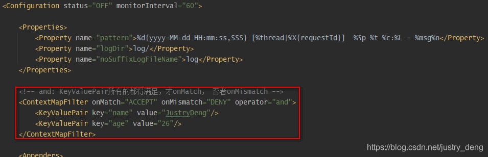 | ThreadContextMapFilter | 通过context(可以理解为一个Map)中对应的key-value值进行过滤 注:上下文默认是ThreadContext,也可以自定义使用ContextDataInjectorFactory配置ContextDataInjector来指定。 | 是 |