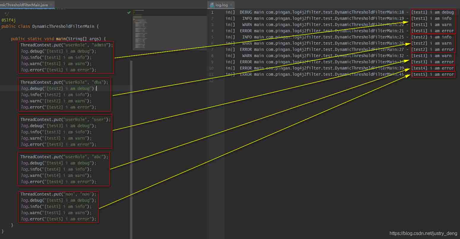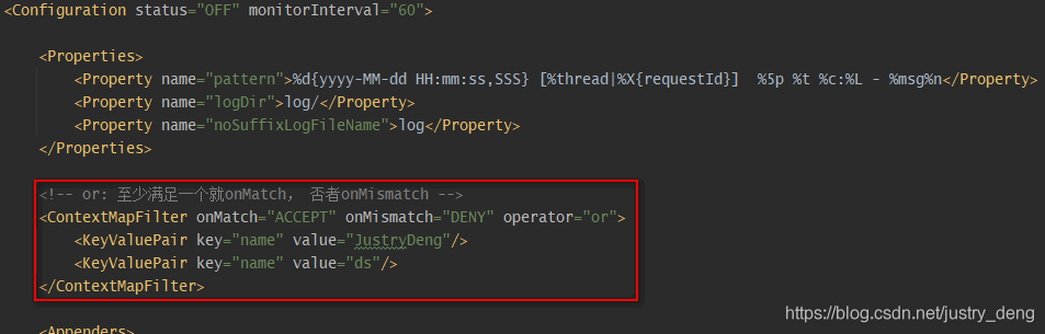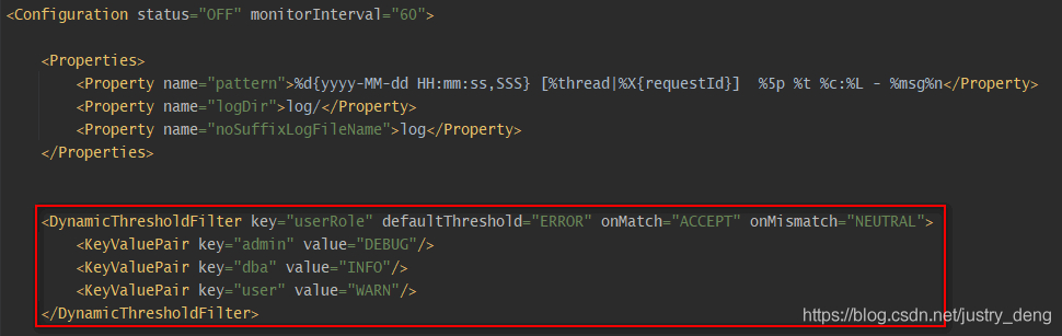 | DynamicThresholdFilter | 若上下文中包含指定的key,则触发DynamicThresholdFilter生效;若该key对应的value值等于任意一个我们指定的值,那么针对本条日志,可记录日志级别的约束下限调整为指定的级别 注:上下文默认是ThreadContext,也可以自定义使用ContextDataInjectorFactory配置ContextDataInjector来指定。 示例说明:<DynamicThresholdFilter key="loginRole" defaultThreshold="ERROR" onMatch="ACCEPT" onMismatch="NEUTRAL"><KeyValuePair key="admin" value="DEBUG"/><KeyValuePair key="user" value="warn"/></DynamicThresholdFilter>配置,有以下情况: 情况一:存在键loginRole,假设从上下文(可以理解为一个Map)中取出来的对应的值为user,那么此时,对于日志级别大于等于warn的日志,会走onMatch;其它的日志级别走onMismatch。 情况二:存在键loginRole,假设从context(可以理解为一个Map)中取出来的对应的值为admin,那么此时,对于日志级别大于等于debug的日志,会走onMatch;其它的日志级别走onMismatch。 情况三:【上下文(可以理解为一个Map)中,不存在键loginRole】或【存在键loginRole,但从日志上下文中取出来的值(假设)为abc, 没有对应的KeyValuePair配置】,那么此时<DynamicThresholdFilter key="userRole" defaultThreshold="AAA" onMatch="BBB" onMismatch="CCC">等价于<LevelMatchFilter level="AAA" onMatch="BBB" onMismatch="CCC">。 | 是 |