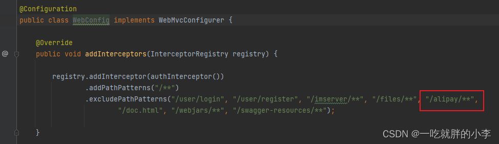 注意:在拦截器里面加上忽略alipay接口的配置!
