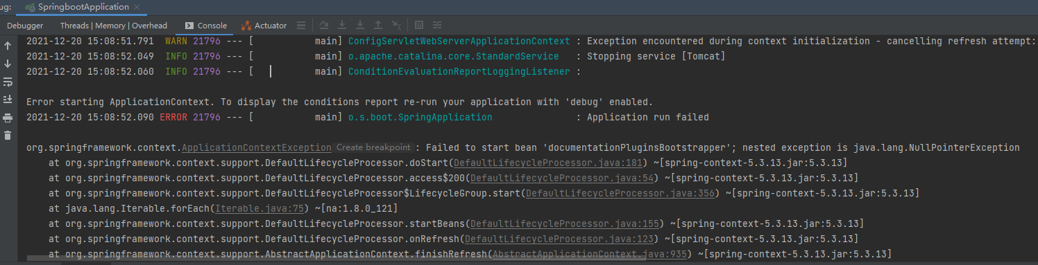 注意:如果出现错误Failed to start bean 'documentationPluginsBootstrapper'; nested exception is java.lang.NullPointerException