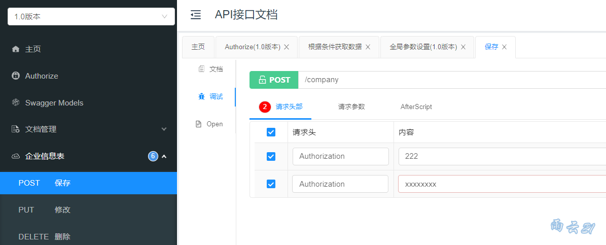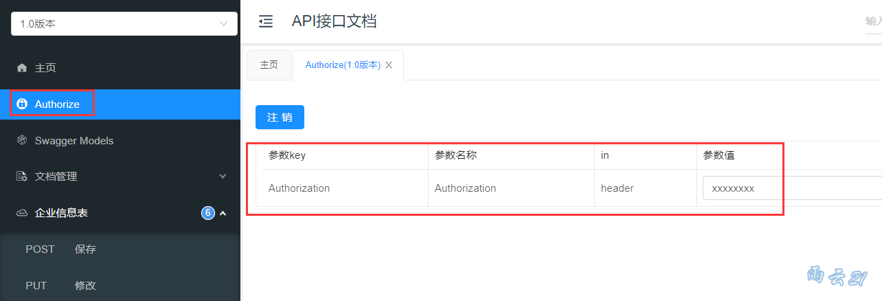 效果:菜单上多了一个Authorize,在参数值中添加上信息