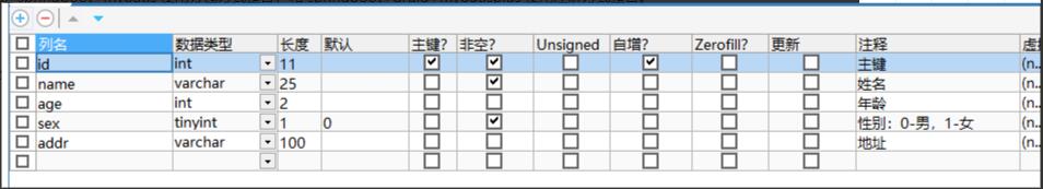 CREATE TABLE `user` ( `id` int(11) NOT NULL AUTO_INCREMENT COMMENT '主键', `name` varchar(25) NOT NULL COMMENT '姓名', `age` int(2) DEFAULT NULL COMMENT '年龄', `sex` tinyint(1) NOT NULL DEFAULT '0' COMMENT '性别:0-男,1-女', `addr` varchar(100) DEFAULT NULL COMMENT '地址', PRIMARY KEY (`id`) ) ENGINE=InnoDB AUTO_INCREMENT=2 DEFAULT CHARSET=utf8