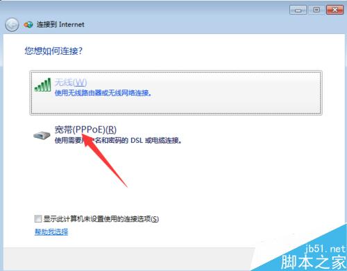3、在“您想如何连接?”对话框中选择如箭头所示:宽带PPPoE