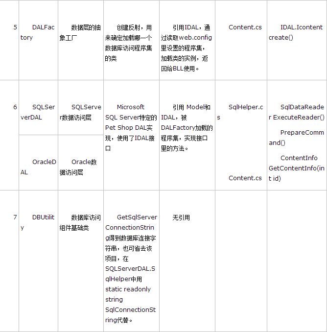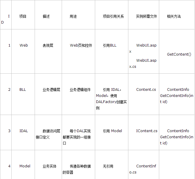 3、BLL层方法GetContentInfo(ID)中取得数据访问层SQLServerDAL的实例,实例化IDAL层的接口对象dal,这个对象是由工厂层DALFactory创建的,然后返回IDAL层传入值所查找的内容的方法dal.GetContentInfo(id)。