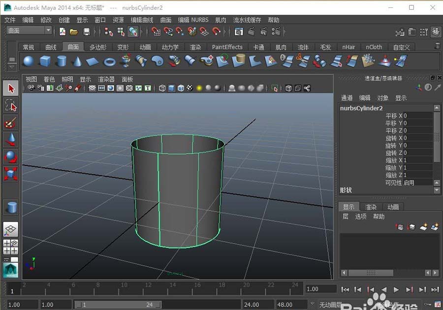 2、在Maya中建立一个曲面圆柱模型,曲面的圆柱模型上下是没有封口的,并且面数较少表面还很平滑。
