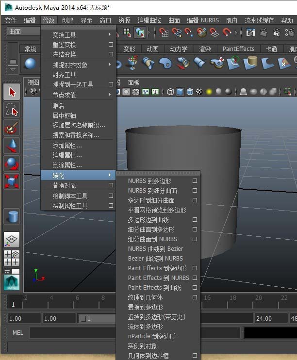 3、选择曲面圆柱模型,找到“修改-转化-NURBS到多边形”命令,我们点击这个命令后面的“编辑”(就是那个小方框)