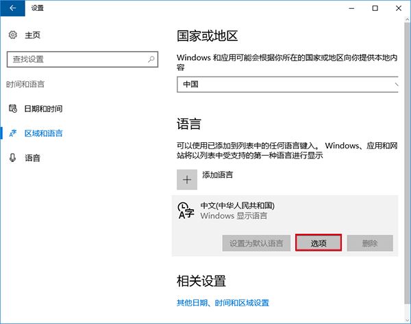 2、在右侧的“语言(Language)中,如果你在安装前已经设置了中文,那么就会显示中文信息,但这只是显示支持,并不是整体汉化,如果想要汉化的彻底,你得下载语言包,点击“中文(中华人民共和国)里的“选项(Options);如果你在安装时没设置中文,得在“添加语言中找到中文,然后再设置