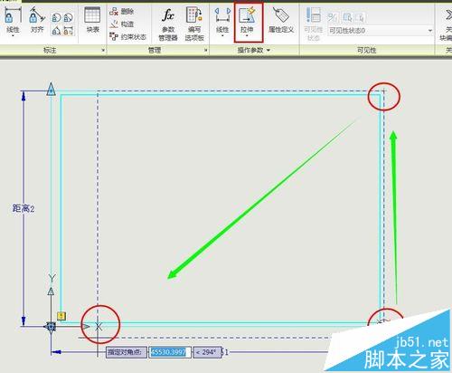 5、垂直方向一样的操作方法,注意块编辑时,距离和拉伸动作取点的位置关系——垂直。选择垂直【距离2】时,选择的点和对象都是于【距离2】垂直的。