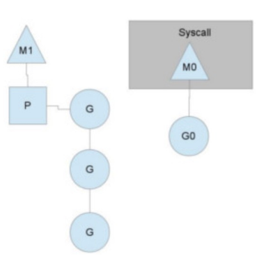 如果当前,G0由于I/O,系统调用进行了阻塞,这个时候M0就可以放开其他的线程: