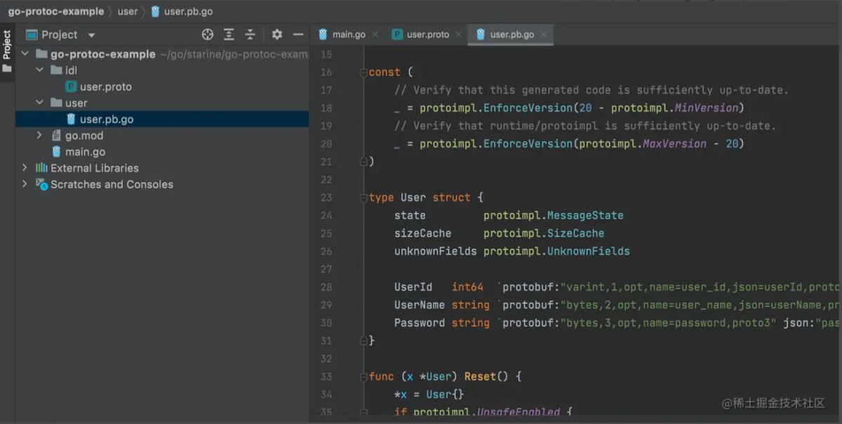 将会自动生成对应的user目录,存放生成的user.pb.go文件: