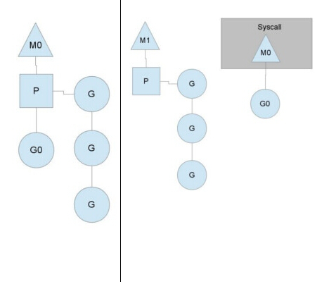 当正在运行的G0阻塞的时候(IO之类的),会再创建一个新的内核线程(M1),P转到新的内核线程中去运行。