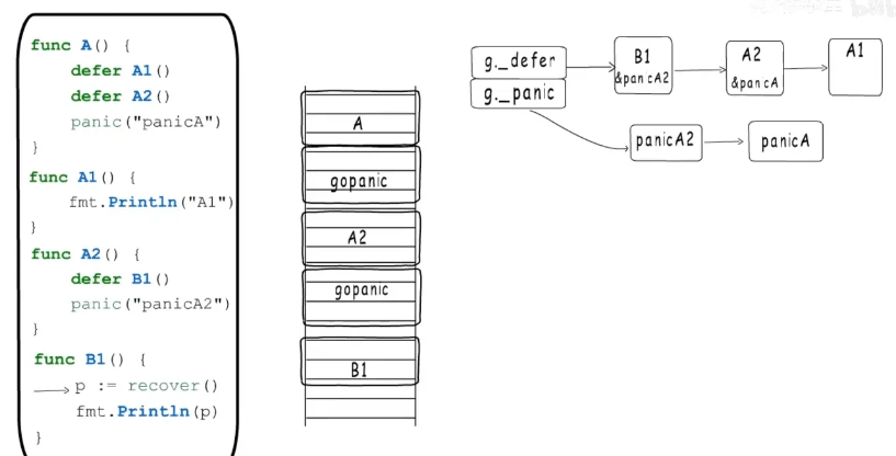 当recover的函数又发生panic时,goroutine会将该panic加入到链头,设置为当前panic,再去执行defer链表,发现当前defer是当前panic执行的,移除当前defer,继续执行下一个,直到发现不是当前panic执行的,在panic链上找到那个panic,输出异常信息