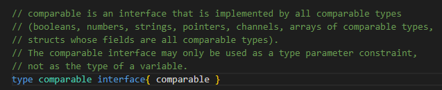 comparable: 表示go里面所有内置的可比较类型:int、uint、float、bool、struct、指针等一切可以比较的类型