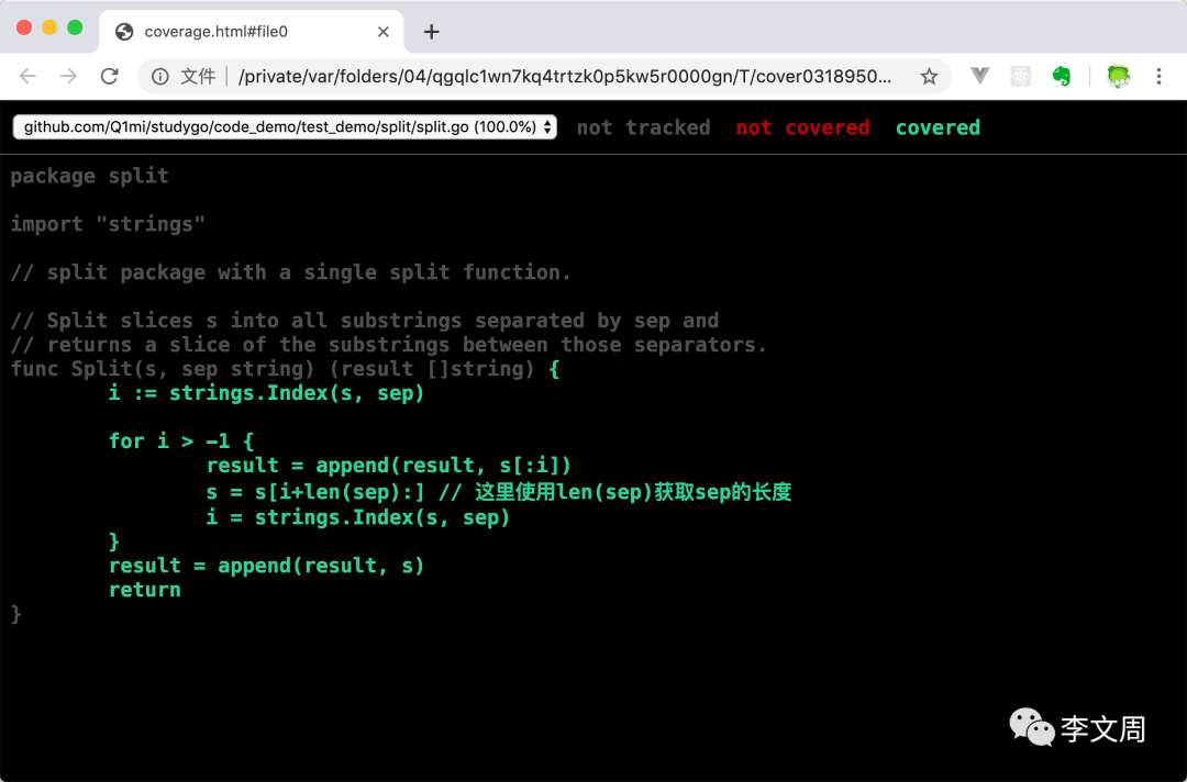 Go还提供了一个额外的-coverprofile参数,用来将覆盖率相关的记录信息输出到一个文件。例如: