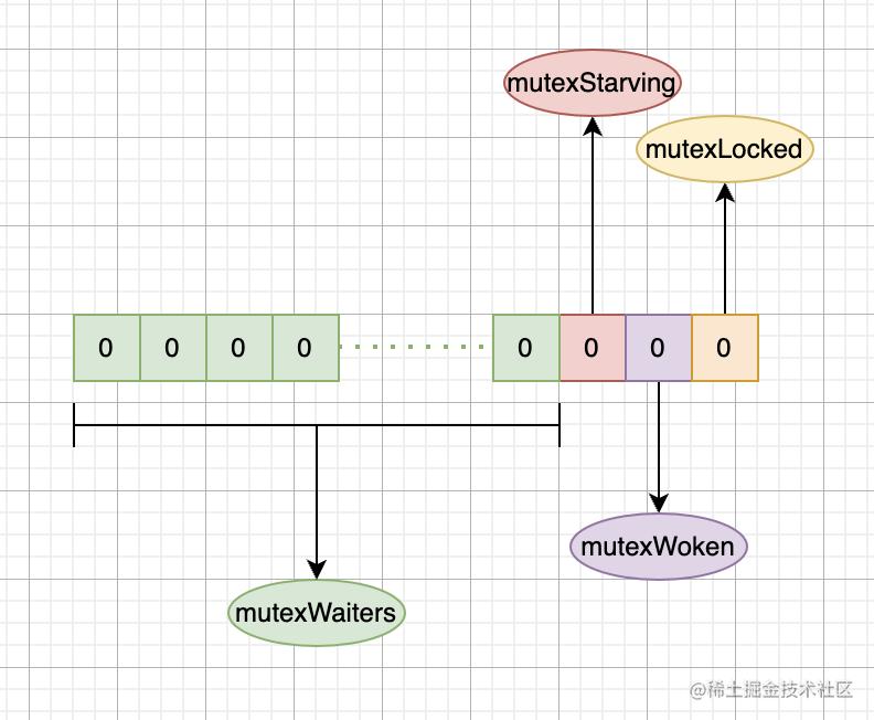 初看结构你可能有点懵逼,互斥锁应该是一个复杂东西,怎么就两个字段就可以实现?那是因为设计使用了位的方式来做标志,state的不同位分别表示了不同的状态,使用最小的内存来表示更多的意义,其中低三位由低到高分别表示mutexed、mutexWoken 和 mutexStarving,剩下的位则用来表示当前共有多少个goroutine在等待锁: