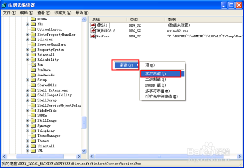 6、依次进入“HKEY_LOCAL_MACHINE”→“SOFTWARE”→“Microsoft”→“Windows”→“CurrentVersion”→“Run”,然后右击,选择“新建”→“字符串值”。