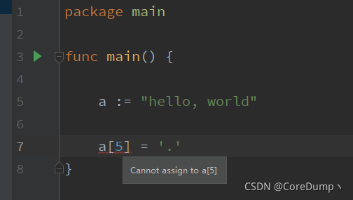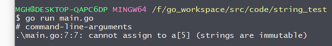 Golang中的字符串是不可变的,不能通过索引下标的方式修改字符串中的数据: