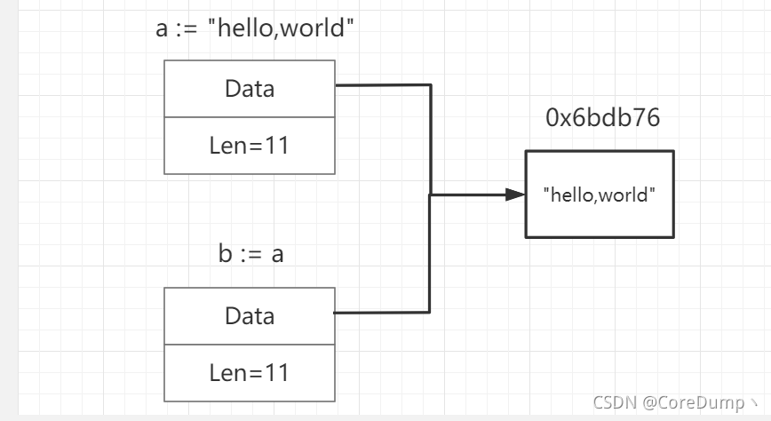 Golang中的字符串的赋值并不是拷贝底层的字符串数组,而是数组指针和长度字段的拷贝。例如:当我们定义了一个字符串 a := “hello,world” 然后定义了 b := a 底层所做的操作只是创建了两个StringHeader的结构体,它们的Data字段都指向同一段数据,如下图: