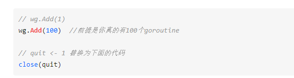 当我们就需要向quit通道中发送100次数据,如果再用以上的代码就很麻烦,有一个很简单的方法,关闭channel,这样所有监听quit channel的goroutine就都会收到关闭信号,上面的代码只要做一个很小的替换就能工作