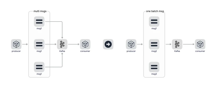 那怎么解决这个问题呢?答案是做消息的聚合。之前发送一条消息就会产生一次网络IO和一次磁盘IO,我们做消息聚合后,比如聚合100条消息后再发送给Kafka,这个时候100条消息才会产生一次网络IO和磁盘IO,对整个Kafka的吞吐和性能是一个非常大的提升。其实这就是一种小包聚合的思想,或者叫Batch或者批量的思想。这种思想也随处可见,比如我们使用Mysql插入批量数据的时候,可以通过一条SQL语句执行而不是循环的一条一条插入,还有Redis的Pipeline操作等等。