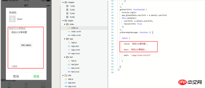 在index/index.js里面添加了一段自定义分享的代码如下, path: '/page/index?id=123',实现了index首页页面的分享功能
