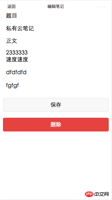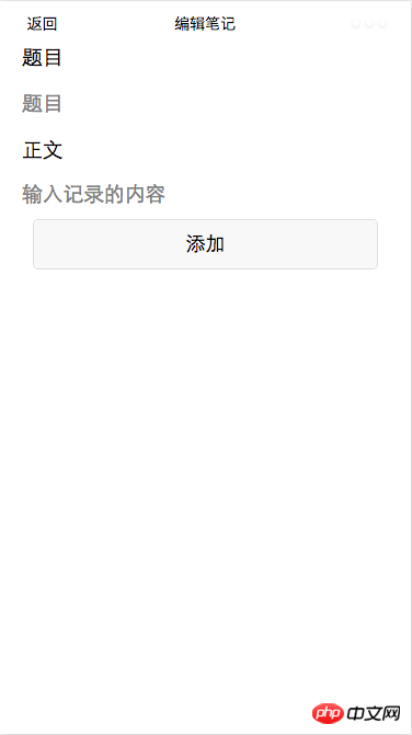 <!--addNote.wxml--> <form bindsubmit="save"> <label class="label">题目</label> <view class="log-list"> <input name="title" type="text" value="{{title}}" placeholder="题目"/> </view> <label class="label">正文</label> <view class="log-list"> <textarea name="context" value="{{context}}" auto-height placeholder="输入记录的内容" maxlength="-1"/> <view class="submit"><button form-type="submit">添加</button></view> </view> </form>登录后复制对应以下页面