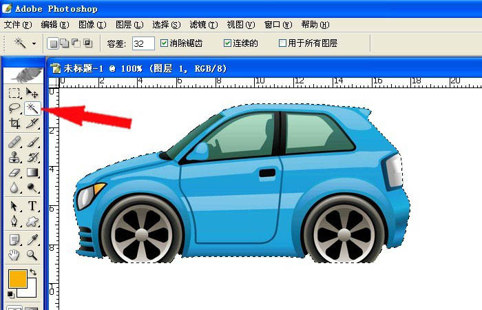 2、鼠标左键在工具栏的魔术棒工具上单击,然后在图片的空白区域单击,再进行选择区域的反选,将卡通汽车图选取出来。