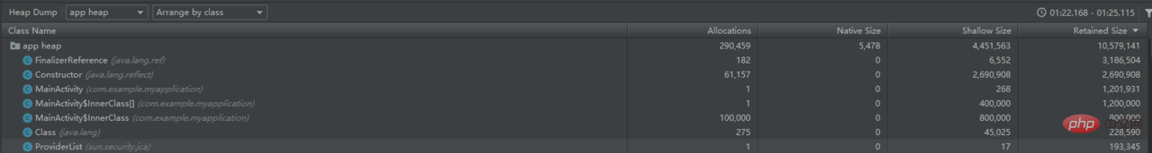 对比两图,我们可以看到第二张图中多了很多 Constructor和Class对象实例,这两部分占用的内存2.7M。因此,我们可以得出结论,反射会产生大量的临时对象,并且会占用额外内存空间。
