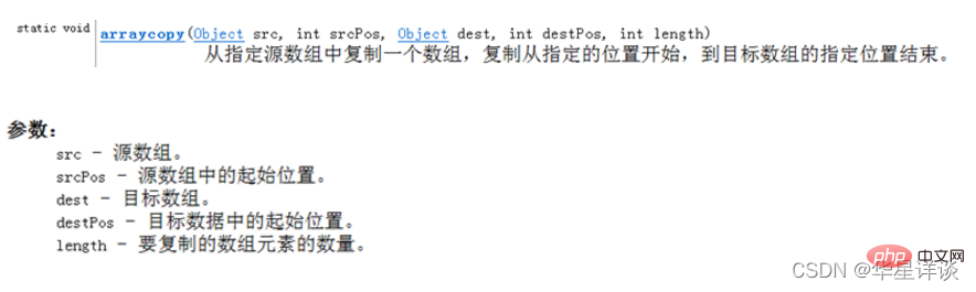 - 源数组中位置在 srcPos 到 srcPos+length-1 之间的组件被分别复制到目标数组中的 destPos 到 destPos+length-1 位置。