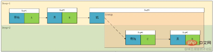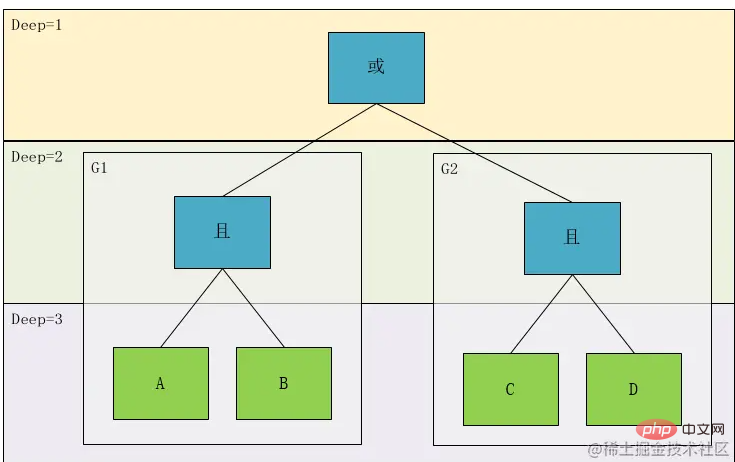 我们再看上面这个图,Deep1 的关系是Deep2中 A且B 和 C且D两个表达式计算出的结果再进行与或关系的,我们设A 且B 为 G1, C且D为 G2,于是我们发现关系节点关联的类型有两种类型,一种是条件Condition ,一种是组Group