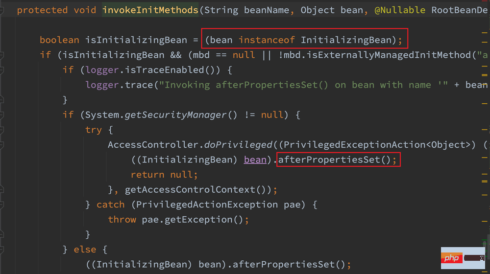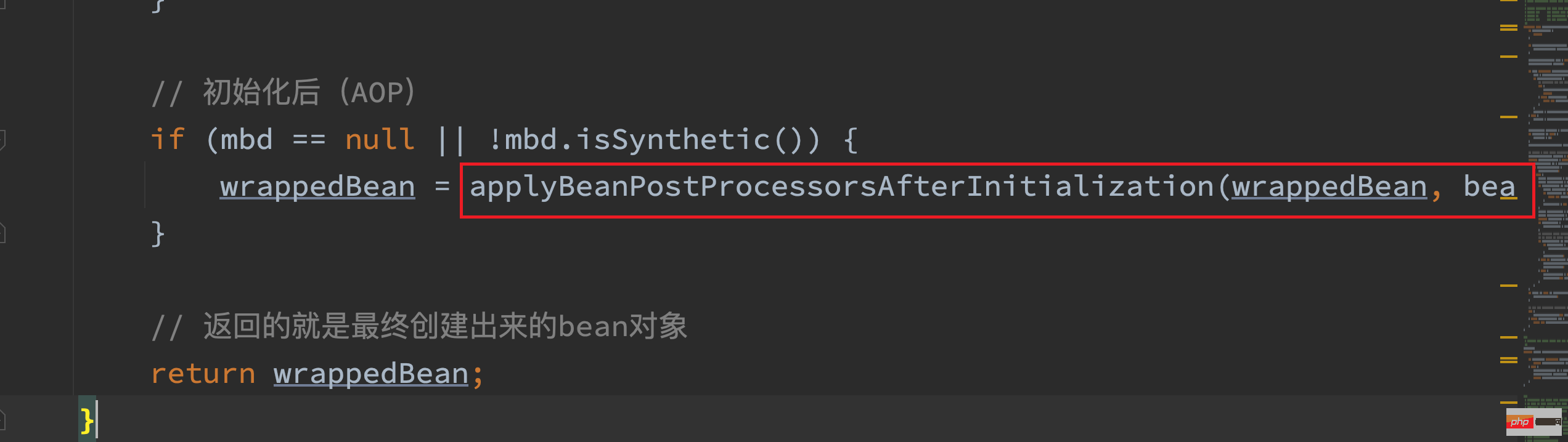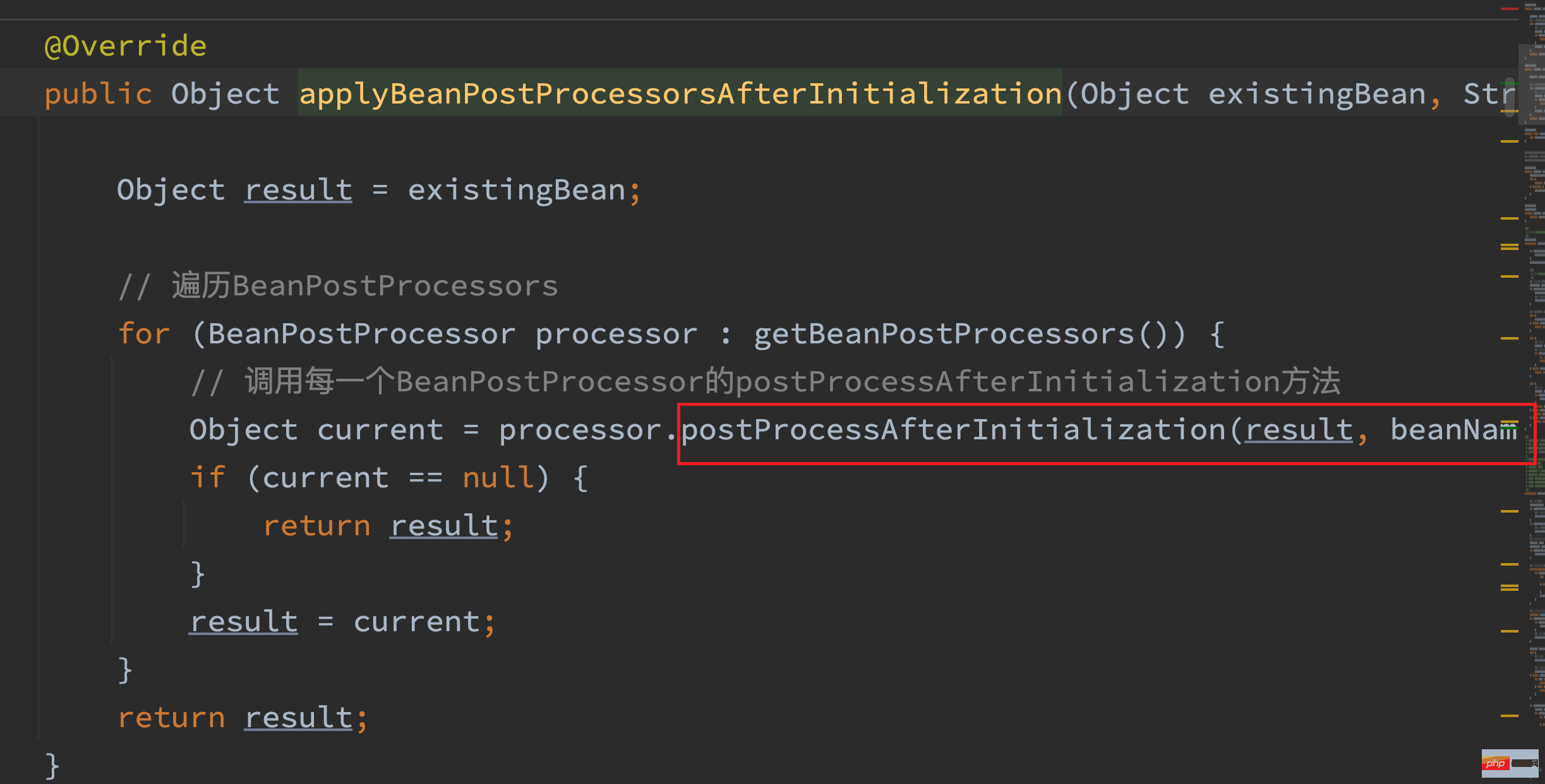 @Componentpublic class ZhouyuBeanPostProcessor implements BeanPostProcessor { @Override public Object postProcessAfterInitialization(Object bean, String beanName) throws BeansException { if ("userService".equals(beanName)) { System.out.println("初始化后"); } return bean; }}登录后复制可以在这个步骤中,对Bean进行最终处理,Spring中的AOP就是基于初始化后实现的,初始化后返回的对象才是最终的Bean对象。