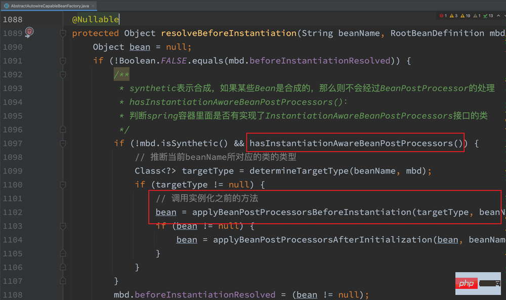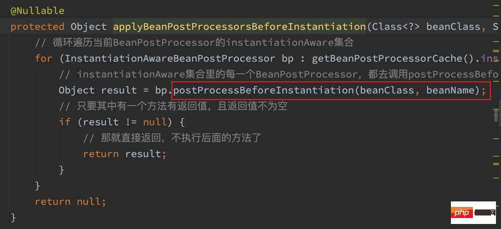 @Componentpublic class ZhouyuBeanPostProcessor implements InstantiationAwareBeanPostProcessor { @Override public Object postProcessBeforeInstantiation(Class<?> beanClass, String beanName) throws BeansException { if ("userService".equals(beanName)) { System.out.println("实例化前"); return new UserService(); } return null; } }登录后复制userService这个Bean在实例化前会直接返回一个由我们所定义的UserService对象。如果是这样,表示不需要Spring来实例化了,并且后续的Spring依赖注入也不会进行了,会跳过一些步骤,直接执行初始化后这一步。